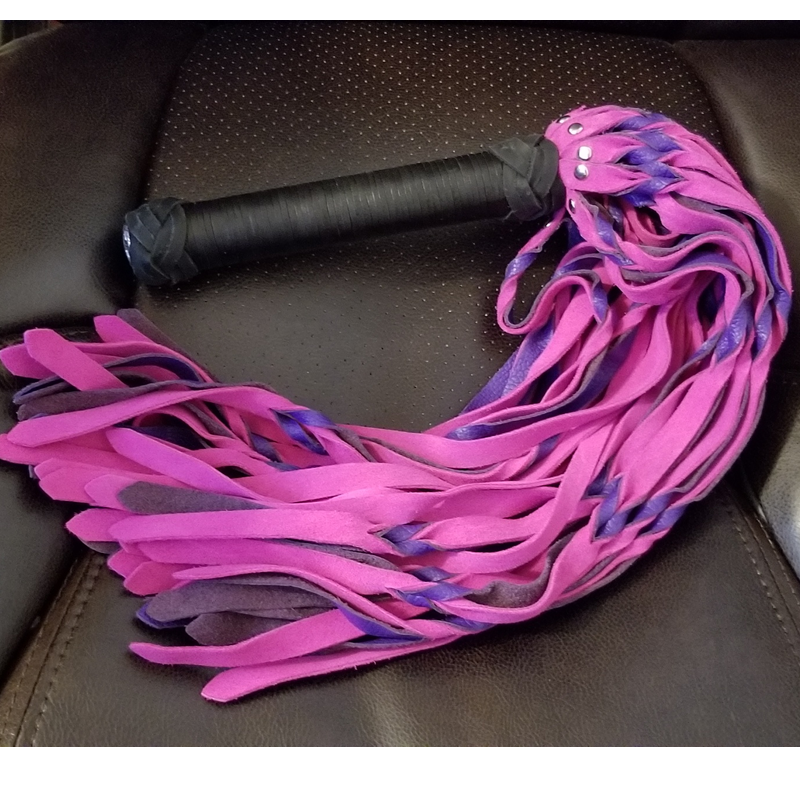 This flogger features approximately 30 tails with 20 additional tails riveted onto the original tails and braided together to make the sensation a heavier impact. This makes the flogger a total of 50 tails. This gorgeous flogger has a very thuddy impact. 4 week turn around time from time of order for delivery custom made upon order..
