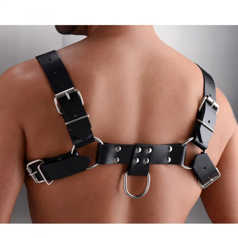 This enticing chest harness will wrap your partner in leather and metal for an exciting look and exotic feel. Featuring multiple points of adjustment, this harness is designed to adorn his chest and add to the look and feel of your next bondage scene. A D-ring at the front and back allow you to attach ropes, leashes, or restraints for more bondage possibilities. Let this sexy piece spark your imagination.